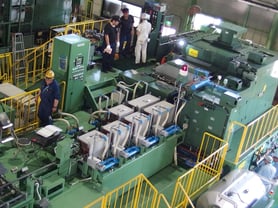 右の写真は搬入・設置が完了し、細かい作業を行っているところです。鍛造機の全体像となっています。